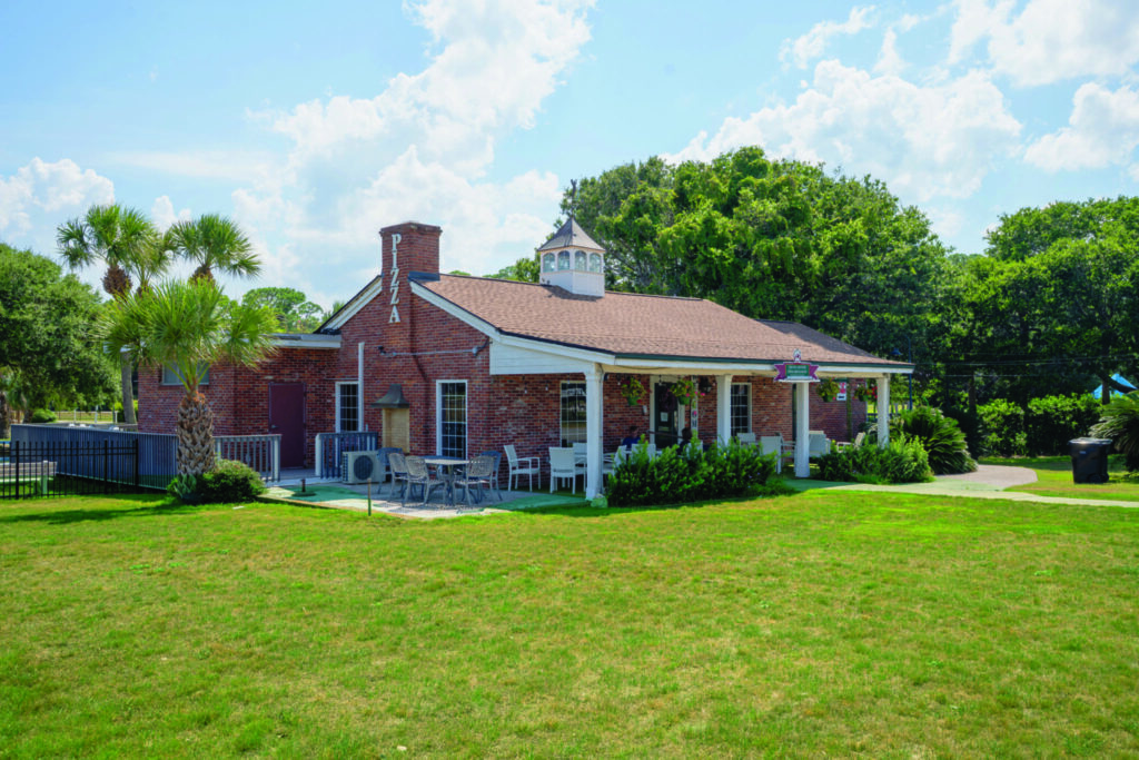 In the 1950s, a fire deemed the cottage unsalvageable, and it was demolished. Its bricks, however, were extensively reused throughout other island projects. Notably, these salvaged bricks constructed the Great Dunes Golf Course clubhouse, which is now home to Red Bug Motors Pizza. “The bricks have a distinctive mottled look because they are from the early 20th Century. [They are] soft-fired, red clay bricks; the entire exterior of the structure is clad in them,” says Taylor Davis, the historic preservationist for the Jekyll Island Authority. In addition to the Great Dunes clubhouse exterior, several other buildings, such as a bike barn and some of the brick mini golf structure, are also outfitted with the bricks.
